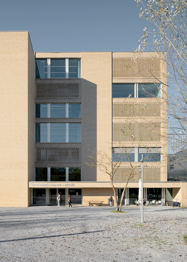 The new building for the Lucerne University of Applied Sciences and Arts – Music on the Campus Südpol in Kriens brings together all the facilities of the Department of Music under one roof. The building houses teaching and practice rooms, a public library, a jazz club, a black box theatre and a concert hall for 280 guests. The central element is the cascading foyer, which extends over all floors and is characterised by four sound and light towers. The use of wood and concrete in the interior and the clinker brick façade support the sustainable construction and give the building a timeless aesthetic.