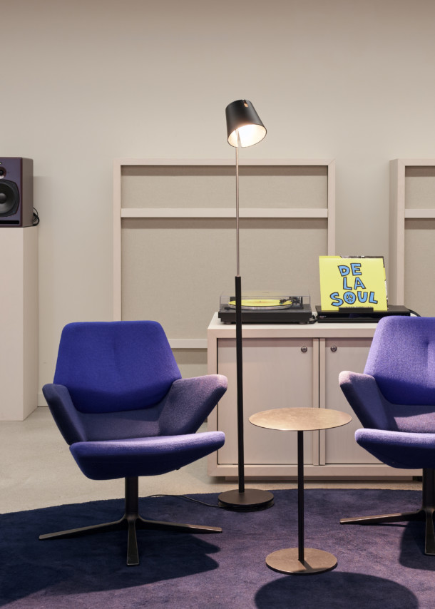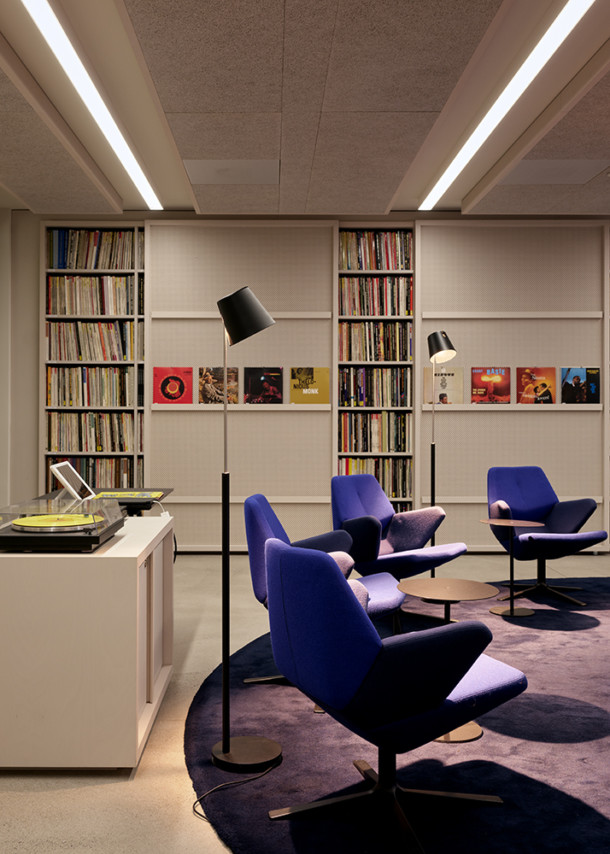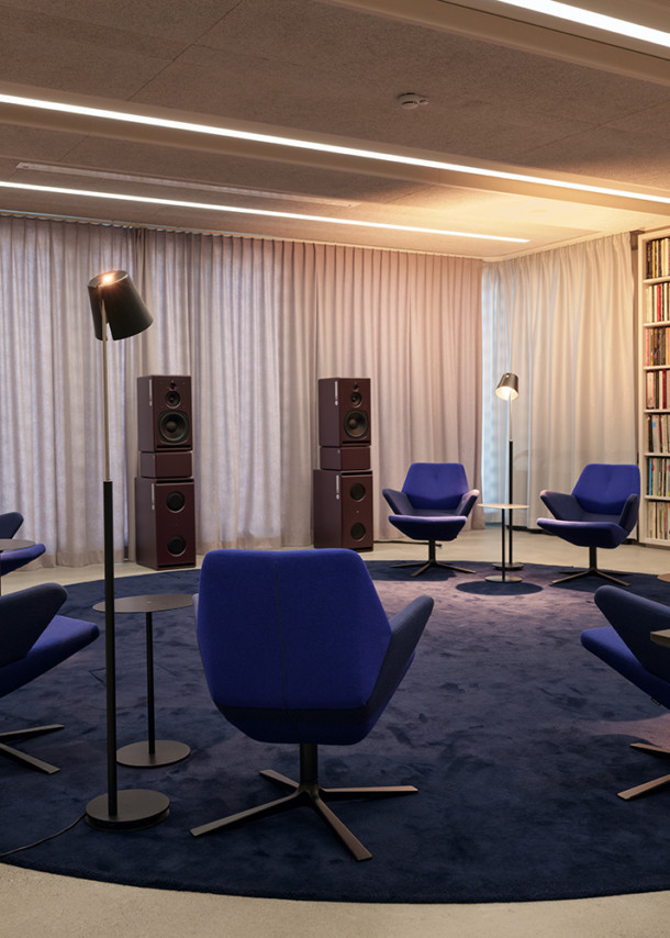In the audio room, which houses an extensive record collection, the FEZ floor lamp creates a warm and calm atmosphere with its soft, directional light. It creates ideal conditions for concentrated listening and blends harmoniously into the overall architectural concept with its minimalist design.