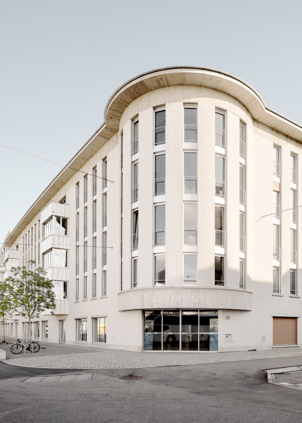 Der Neubau des Zürcher Lighthouse im Hardquartier ist Teil der Wohnsiedlung Egligasse. Der Baukörper fügt sich mit seiner klaren Volumetrie und einer charakteristischen Rotunde an der Hohlstrasse selbstbewusst in den urbanen Kontext ein. Die Fassade aus hellem Kalksandstein, die harmonische Gliederung und die gezielte Öffnung zum begrünten Innenhof verleihen dem Gebäude eine ruhige, würdevolle Präsenz.